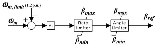 When the wind speed is above the rated speed, the pitch angle control mode adjusts the pitch angle thereby reducing the power obtained from the wind. Figure 6 shows the pitch angle controller, which is based on a PI control for processing the error between the rate value and angular speed of the generator/turbine. When the wind turbine operates with a power optimization strategy or power limitation, this control mode limits the rotational speed to maintain a reliable operation range for the PMSG. This work focuses on the maximum rotational speed of 1.2 p.u. with a reduction of certain fatigue loads as an additional objective. This controller adjusts the pitch angle based on a comparison of ωm. The reference pitch angle βref is determined by the PI controller. The operating rotational speed must be limited between 0.7 and 1.2 p.u. The pitch angle control of a PMSG wind turbine can be summarized as follows: