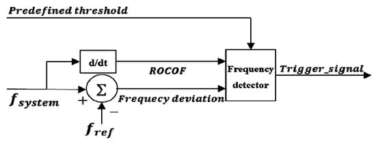 Here, fsystem is a system frequency and fnominal is the nominal frequency (60 Hz). Equation (21) represents the amount of required active power that can be computed using the ROCOF and indicates the security index of the grid disturbance. When the frequency of the system continuously decreases below a frequency standard, the frequency detector continuously provides the trigger signal to regulate the system frequency.