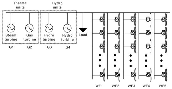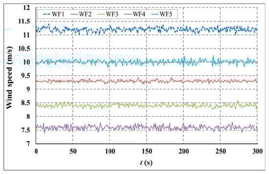The validity of the proposed optimal control and operation strategy was demonstrated by applying it to a simulated power system, as illustrated in Figure 10. This system is composed of thermal units, hydro units, and wind farms. The thermal units are combined with a gas turbine G2 (50 MW) and steam turbine G1 (100 MW). The hydro units have two hydro turbines G3 and G4, rated at 70 MW and 60 MW, respectively. The load is based on modeling to represent a linear frequency dependency on the active power characteristics. Wind farms WF1–WF5 (each 16 MW) were linked to the small power system and an individual wind farm consists of eight PMSG wind turbines (each 2 MW). To solve the KE optimization problem, the maximum iteration number in the PSO is set to 100, and the population size is set to 50. r1 and r2 are uniform random factors with assigned values between 0 and 1 in each step and for each particle component to add randomness to the velocity update. The inertial weight w is set to reduce from 0.9 to 0.4 in different iterations. Each of the acceleration coefficients, c1 and c2, is set to between 0.5 and 2.5 to achieve a mean value of unity for the stochastic factor [30]. Based on the characteristics of the wind turbine, Figure 11 depicts the correlated wind speed profiles for individual wind farms in the small power system. These results are simulated using the PSCAD/EMTDC tool by adopting the parameters described in the Appendix A.
