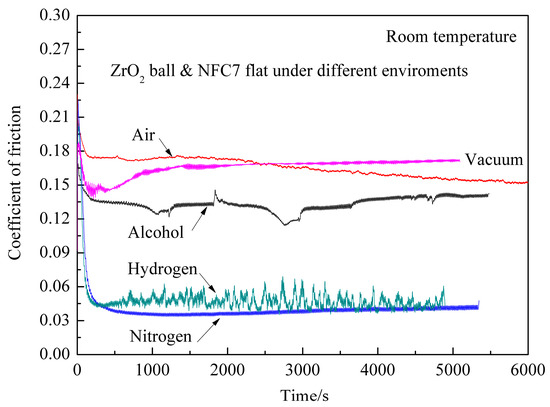 COF of ZrO2 ball/DLC films under different environments at 200 °C.