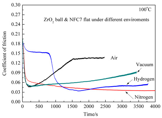 CoF of ZrO2 ball/DLC films under different environments at 100 °C.