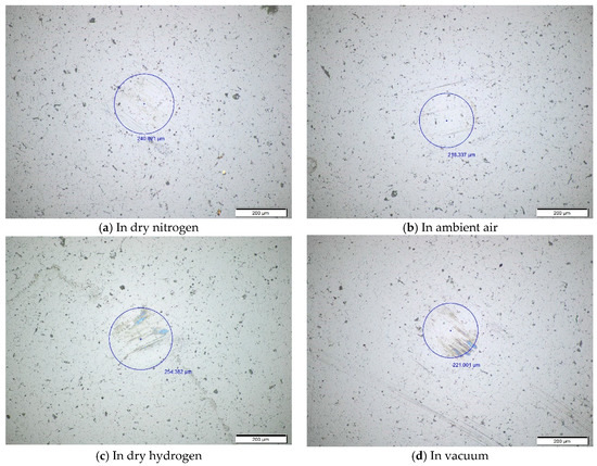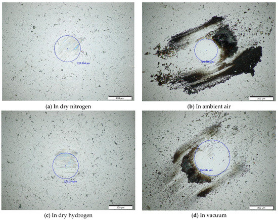 The worn surface topography of ball under different environments at the temperature of 100 °C is almost the same as that at room temperature. There are shallow plow grooves on the ball surface in ambient air and dry nitrogen, as shown in Figure 6a,b. However, in dry hydrogen and vacuum, there are not only shallow plow grooves but also the color transferred from the films onto the worn surface of the ball, as shown in Figure 6c,d.