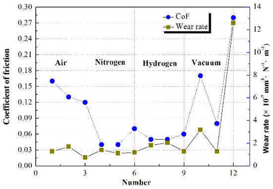 CoF and wear of the friction pair under different temperatures and environments.