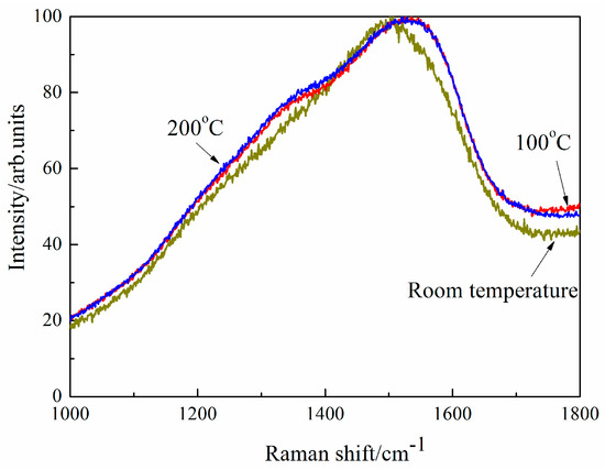 At room temperature, CoF is low and stable in the application of solid lubrication of DLC films. CoF is ultralow when the transferred films are formed on ball in dry nitrogen, hydrogen and even vacuum environment. CoF in dry nitrogen is lowest because the chemically passive surface cannot to be oxidized in inert gas environment. At 100 °C, there is the slight graphitization in DLC films (as shown in Figure 9) under high friction heating and pressure simultaneously. DLC films are transferred to the contact surface of ball, and the friction interface of ball is partially covered by the transferred films. According to Raman spectroscopy analysis, the transferred films on the worn surface on ball are carbon-related materials, which result in low CoF compared with the tribotest in ambient air. At 200 °C, CoF is as ultralow as 0.02 in ambient air due to the tribochemistry reaction during sliding. However, CoF increases in dry nitrogen, hydrogen and vacuum at 200 °C. The experimental results show that the antifriction behavior of ZrO2/DLC films is influenced significantly by the environment temperature.