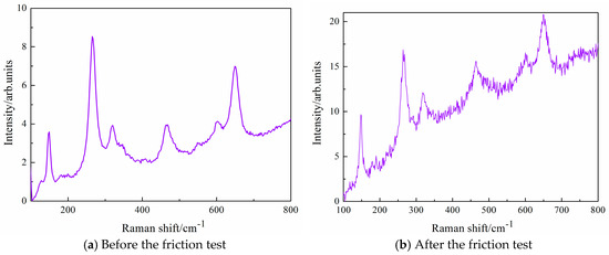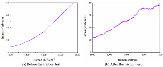 Raman spectra of the transferred films on the worn surface of ZrO2 ball: (a) before the friction test; (b) after the friction test.