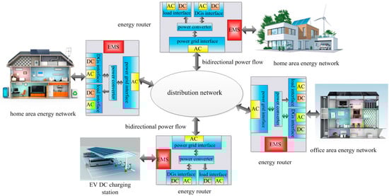 Figure 1 is the vision of the energy router-based HEMS in the future Energy Internet. The energy routers will serve as the “energy hub” between the energy subsystems (could be a house, an office or a charging station) and the distribution network, as well as the energy interfaces (both AC and DC) for all the DGs, energy storage system and loads within the home area energy network. The EMS of the energy router will schedule the energy prosumption within the home area energy network such that energy is distributed adequately among the loads, and redundant energy from the DGs could be stored by ESS or fed back into the distribution grid.