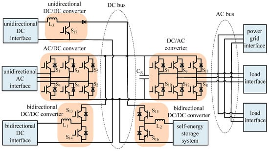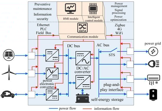 As shown in Figure 3, there are various topologies for the power electronic converters to accommodate different types of DGs and ESSs. A bidirectional DC/AC converter lies between the DC and AC buses. The plug-and-play power interfaces for DGs and loads can be classified into unidirectional AC or DC interfaces for the DGs and loads, and bidirectional DC interfaces for the EV and ESS. Power metering modules are embedded in the plug-and-play power interfaces to monitor the operation status and power quality of the DGs, and upload these measurements to the intelligent control module. Besides, protection functionalities are also provided by the plug-and-play interface in case faults or failures may occur.