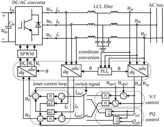 The inner current loop can be used to restrain the influence of load disturbances and improve dynamic response of the AC system. It works based on the reference current value generated by V/f control and can also be expressed by Equation (4). Unlike PQ control, a virtual phase-locked loop is utilized by the V/f controller to acquire a constant frequency, and sinusoidal signal generated by the virtual phase-locked loop is taken as the reference vector. As stated above, the direction of d axis coincides with this vector, then usqref should be zero.