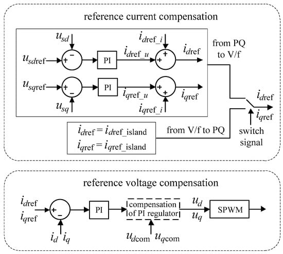 It can also be utilized when the main converter switches from V/f control to PQ control. Equation (6) indicates that the PI regulator outputs before switching are added as compensation during the course of switching. When the main converter switches from PQ control to V/f control, ud_i and uq_i are used as the compensation items udcom and uqcom as shown in Figure 5. When the main converter switches from V/f control to PQ control, ud_u and uq_u are used as udcom and uqcom.