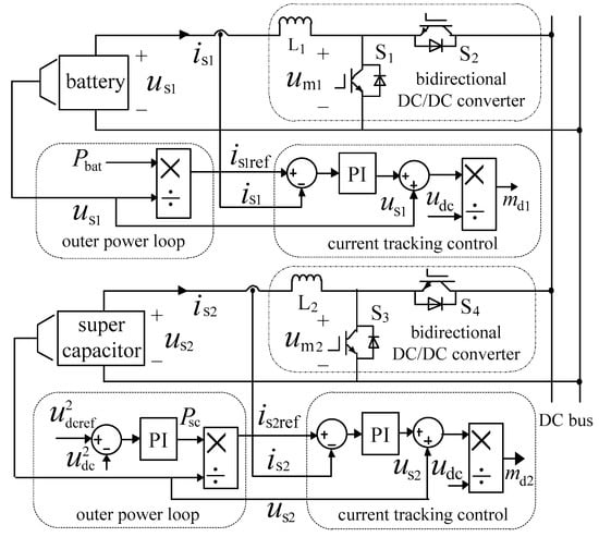The self-energy storage system consists of a battery unit and a supercapacitor, because the combination of their characteristics has complementary advantages for stabilizing the DC bus voltage []. As shown in Figure 3, the battery and supercapacitor are connected to the DC bus through bidirectional DC/DC converters.