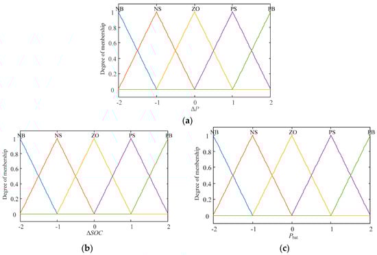 Membership functions of the input and output: (a) Membership function of ΔP; (b) Membership function of ΔSOC; (c) Membership function of Pbat.