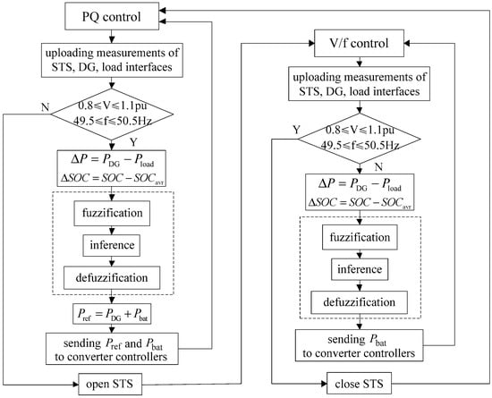 The process of power management for the energy router is formulated as shown in Figure 8. Comparing with the power management in isolated mode, the difference in grid-connected mode is the method to determinate active reference power of the PQ control. After getting the Pbat through the fuzzy logic controller, the sum of PDG and Pbat is chosen as the active reference power.
