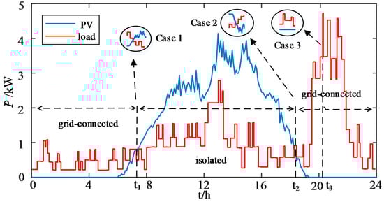 Figure 9 shows the daily measurements of PV generation and load consumptions of the energy router-based HEMS. The HEMS is in grid-connected mode and imports energy from the power grid during 0–t1 and t2–24, since the PV power generation is lower than load consumption. During the period between t1 and t2, the HEMS is in isolated mode. Because the HEMS will experience operation mode switch between grid-connected mode and isolated mode at the moment of t1 and t2, the operation of the HEMS at these moments will be investigated as study cases to verify the effectiveness and feasibility of the proposed control and management strategy for the energy router. The load power reaches the maximum point at t3, before which the power of PV output is already zero. Then the situation around the moment of t3 is chosen as another case to demonstrate the potential of the energy router-based HEMS in collaboration with the power grid to suppress the impact of load consumption fluctuations.