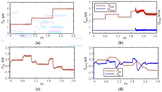 Case 1 investigates the characteristics of the energy router-based HEMS in response to rapid increase of PV generation and transition from grid-connected mode to isolated mode. The variations of the PV output and load consumptions are shown in Figure 10a,b. As shown in Figure 9, solar irradiance varies rapidly around the moments of t1 and t2. As a consequence, PV output rises from 1.5 kW to 2.5 kW at 1.0 s, and then to 4 kW at 2.0 s. Meanwhile, the active load power changes from 2.25 kW to 3 kW at 0.6 s, to 2.5 kW at 1.2 s, to 3.5 kW at 1.8 s and 3 kW at 2.4 s, respectively. The reactive load power remains 0.5 kVar all the time. The HEMS switches from grid-connected mode to isolated mode at 2.0 s.