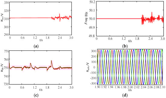 Figure 11d shows the three-phase voltage waveforms of the AC bus during the course of mode switching. The reference voltage and current compensation strategy ensures smooth transition at 2.0 s and there is no distortion on voltage waveforms. After 2.0 s, voltage amplitude isn’t 311 V seriously, which corresponds to the situation in Figure 11a.