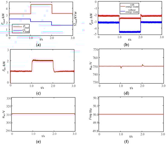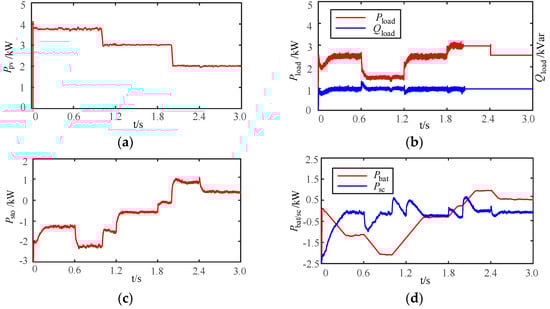 Case 3 investigates the characteristics of the energy router-based HEMS in response to drastic variations of load consumptions and its functionality to collaborate with the power grid in suppressing the impact of load consumption fluctuations. The active load power increases to the peak value during 1.0–2.0 s, which corresponds to the situation around t3 in Figure 9. The active load power decreases drastically at 2.0 s. The simulation results are demonstrated in Figure 15.