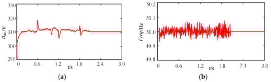It is observed from Figure 13a that the AC bus phase voltage is in dynamic balance under the V/f control before 2.0 s. After that, the AC bus voltage is synchronized with the power grid voltage. The situation of the AC bus frequency is same as the AC bus voltage; fluctuations in frequency occur during isolated mode.