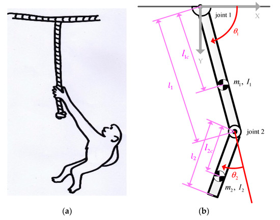 (a) A monkey swings in a tree and (b) the simplified two-link model.
