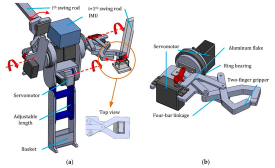 The computer-aided drafting (CAD) drawing of the robot is shown in Figure 2a. The robot has two arms, which are designed to grab/release the rope (i.e., the swing rods). By programming the arms to grab/release the rope/rod alternatively, the robot is capable of swinging among different ropes/rods as a monkey does. Thus, the upper body of the model described in Section 2, in reality, is composed of the main upper robot body, two arms, and the rope/rod. In contrast, though a monkey has two legs and a tail, the lower robot body is designed as a rigid box, which allows us to directly map that to the lower body of the model. The rigid box is designed to have several mounting holes and a small basket, as shown in the figure, so the length and mass of the lower body can be easily adjusted. Because of these adjustable designs, we can alter the variable and in Section 2, which can enhance the robot’s moment of inertia and make the movement optimal.