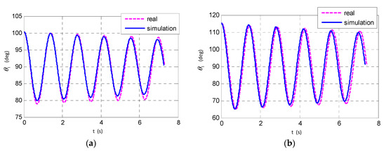 The free swing test of the model/robot was conducted to determine the damping coefficient of the model. The experimental environment was set up to record the robot’s motion for quantitative analysis. Five markers were mounted in the setup: two on the top of two rods (i.e., two joint 1s), one on the COM, one on the arm, and one on the lower body. When the robot swung or brachiated on the rod, its sagittal-plane motion was recorded by a stationary high-definition (HD) camcorder (HDR-SR11, Sony, Tokyo, Japan). While the qualitative motion of the robot can be easily observed by the video, the quantitative motion of the robot can be computed based on the markers’ positions in the sequential snapshots taken by the camcorder. In the experiments, the MonkeyBot was posed at two different initial heights (, corresponding to and swings) and released. The robot started to swing, and the swing amplitude gradually decreased, owing to the energy loss. The profile versus time was recorded for data analysis. On the model side, models with various damping coefficients were simulated to generate the corresponding versus profiles. Next, the root mean squared (RMS) errors between the peak value of trajectories in the first five periods of the robot’s swing motion, and the models with various values were computed. The damping coefficient was selected because this model has the smallest RMS error. Figure 4 plots the trajectories versus of the robot and the model with this damping coefficient, and the subplots (a) and (b) correspond to the initial condition and , respectively. Both plots show a decent trajectory match between the robot and the model, and the RMS errors are and , accordingly.