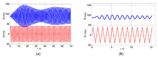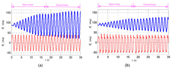 The frequencies shown in Figure 4 represent the natural frequency of the model and the robot. According to a paper [38], the stride frequencies of different-sized animals have a certain relation to their body mass, and those frequencies also match the natural frequencies if the animals are modeled as the spring-mass systems (i.e., resonance region) because the brachiating motion of the robot is basically a pendulum motion that has a certain natural frequency. To actuate the waist of the robot/model at a frequency similar to the natural frequency is similar to driving the legs of the animals at a frequency similar to the natural frequency. The model has a natural swing frequency of around when . If the model starts with the at rest configuration and the joint 2 is actuated with a swing signal at the same frequency, the model can gradually increase its swing magnitude (), as shown in Figure 5a. This control scheme is hereafter referred to as the “open-loop” method. Figure 5a also reveals that the open-loop method can quickly build up energy to increase the swing amplitude to within 15 s. Because the double pendulum is a nonlinear system and the natural frequency changes when the configuration changes, its swing motion does not gradually converge to a certain amplitude, but exhibits amplitude variations. In addition, the model has less capability for disturbance rejection.