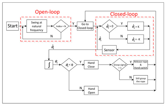 The closed-loop strategy is developed to compensate for the drawbacks of the open-loop strategy. When joint 2 is actuated with the same rotation direction as joint 1 (), the energy generated from joint 2 can be injected into the model. Figure 6 demonstrates this phenomenon. It can be assumed that the model initially swings toward the left () and joint 2 is fixed at a positive angle (), as shown in Figure 6a. After the model reaches its highest left position, as shown in Figure 6b, and starts to change motion direction (), if joint 2 is actuated to have a negative angular velocity (), as shown in Figure 6c, the swing motion of joint 1 () can be maintained to overcome the damping loss or even increased to enlarge the swing amplitude. When the model reaches its highest right position, as shown in Figure 6d, joint 2 has a negative value () and is ready for the next actuation ) after the model starts to change motion direction (). This configuration is identical to the one shown in Figure 6a; thus, the swing motion can be periodically generated. Figure 5b plots the trajectories of the joint 1 angles of the model versus time when the model is actuated with this control scheme. This scheme is hereafter referred to as the “closed-loop” method. The model can successfully build up the swing amplitude to within 4 s; however, the amplitude seems not to increase until the end of simulation (15 s). Moreover, this method was not functional on the robot when it started at a rest condition for two reasons: First, the joint angle measurement () of the robot has noise, and this may lead to a wrong actuation initiation, especially when is close to . Second, empirically, the actuation of joint 2 () needs time to finish its configuration change. When is close to , the control algorithm may quickly switch the motion direction of joint 2, and in this case, the robot cannot correctly initiate its periodic motion pattern. Therefore, the hybrid control scheme is utilized: The model/robot firstly uses an open-loop control strategy. After the swing amplitude approaches the maximum value, the control algorithm switches to a closed-loop to increase the motion control stability. The overall control flow chart is shown in Figure 7.