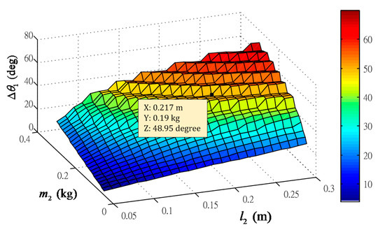 While the size and mass of the upper body is, in general, fixed and determined by the characteristics of the components, the size and mass of the lower body has some freedom to be adjusted for better dynamic performance of the robot itself. The evaluation process was done in simulation, where the link length and mass of the model were varied, and the model was set to swing six periods from its rest position ( and ) with the open-loop control strategy. Because the model with a different size and mass has different natural frequencies, different models use different frequency settings. The performance was judged by the final swing amplitude of the model. Figure 8 shows the simulation result. The figure reveals that as the mass and length of the lower body increases, the swing amplitude increases. Though the longer length and larger weight are preferred, the actuator power is constrained to a certain value because the size and mass of the upper body are given. Thus, the link length and mass are maximized to the value that the motor can sustain. The selected length and mass of the lower body are marked in the figure.