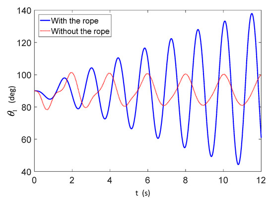 The robot brachiating on the swingable rope/rod has a more concentrated mass/size distribution and a larger distance than that brachiating on a fixed point. The added rope/rod changes the overall system dynamics, and the passive rope/rod enlarges the swing amplitude of the robot, which increases the possibility of grasping the next rope/rod. Figure 9 compares the difference in behavior between the two systems, where the lengths of have different values. One includes the length of rope/rod, and the other does not. As shown in the figure, though the latter has a faster response, the former has a larger swing amplitude.