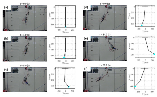 Snapshots of the robot (left) and the two-link model (right) starting from the at rest condition. The robot/model uses the open-loop control method (a–d) and then the closed-loop control method (e,f).