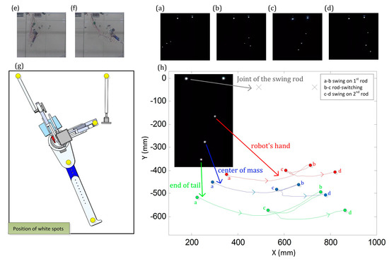 The MonkeyBot in brachiating motion. (a–f) The snapshots of the system captured by the camcorder before (e,f) and after (a–d) image processing; (g) The markers, whose locations are depicted in CAD drawing, were mounted on the MonkeyBot when it swung and switched rods; (h) The overall motion trajectories of the markers/system. The instants marked with a-d correspond with the snapshots (a–d).
