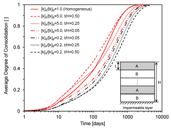 The excess pore water dissipation is significantly affected by the distance from a free-drainage boundary to permeable layer and relative boundary conditions formed by relative hydraulic conductivity k difference among layers. Figure 1 presents the effects of binary mixture sequence and thickness on 1D consolidation process. At the given binary mixture thickness ratio, the excess pore water pressure dissipates faster for the soils in which the layers with higher k are located closer to the drainage boundary (case: [k]A/[k]B = 5.0), even if the volumetric composition of each material is equal [20]. On the contrary, lower k at a top drainage delays the consolidation process (case: [k]A/[k]B = 0.2). Furthermore, introducing internal material heterogeneity (layer thickness) tends to delay or accelerate the dissipation, depending on the k magnitude of the top layer. Figure 2 shows that the relative k magnitude differences between hydraulic conductivity of the layers cause a more delayed dissipation of excess pore water pressure. Smaller layer thickness ratios and lower magnitude differences reduce those specific patterns, yet initial heterogeneity configurations are quite different from the equivalent homogeneous one during dissipation of excess pore pressure. The vertical drainage condition has a pronounced effect on the consolidation process of the binary mixtures. The internal heterogeneity promotes the delayed dissipation of the excessive pore water pressure, yet such differences in consolidation time delay are significantly reduced when radial drainage is allowed (Figure 3a). If the vertical drains are more narrowly spaced, the global consolidation process is controlled more by the radial drainage, and thus the differences in consolidation time are reduced more with a shorter maximum radial drainage path (Figure 3b).