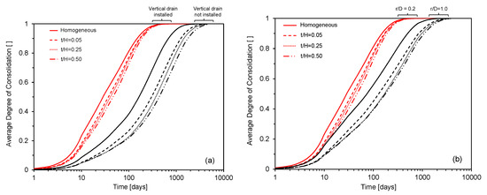 Effect of a vertical drainage conditions on the consolidation of the binary mixtures; (a) vertical drain (r/D = 0.2); (b) vertical drainage distance. The vertical drain is installed along the centerline and radial drainage is allowed. [k]A/[k]B = 0.2 in all cases. The radial consolidation coefficient is assumed to be identical to the vertical one.