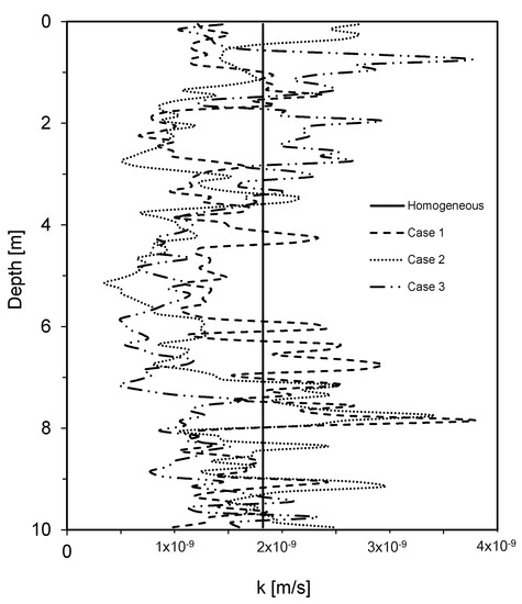 Figure 4 shows three selected realizations of the spatially varying consolidation coefficient profiles. For the realizations, the mean value μ[k] is 1.8 × 10−9 m/s, COV[k] is 0.6, and the correlation length θln k is 1 m. The total thickness of the compressible layers D is 10 m, the maximum radial drainage length r is 2 m, and the radius of the vertical drain is 0.1 m. The consolidation behavior of spatially varying random soils with different drainage conditions is compared in the following Figure 5. The results show that a different configuration with the same even statistic promotes a different consolidation process, and such differences due to the different heterogeneity configurations are reduced by the radial drainage, as discussed in the section on binary mixtures. Case C is the fastest, with a 90% consolidation by a single upward vertical drainage (for 90% consolidation, case A: 2800 days; case B: 3300 days; case C: 2600 days); however, Case C is the slowest for the case of coupled drainage (for 90% consolidation, case A: 520 days; case B: 580 days; case C: 590 days), which indicates that the contributions of spatial variation to the global consolidation process differ with respect to the drainage conditions.
