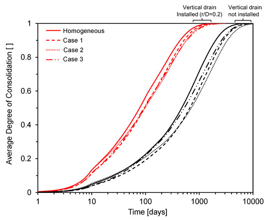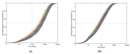 where H is maximum drainage path, and q is applied stress (100 kPa in all cases). A radial drainage condition expedites the consolidation process. The excess pore water pressure across the area of each element is considered, and the 2D average degree of consolidation can be expressed by