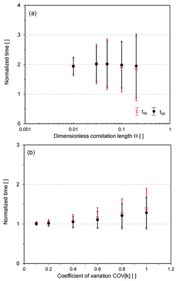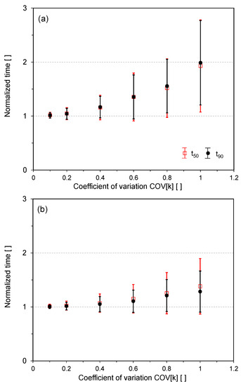 Effect of spatially varying hydraulic conductivity COV[k] on consolidation times t50 and t90 of heterogeneous soils with different drainage conditions; (a) No vertical drainage; (b) Vertical drainage. In all cases, dimensionless correlation length is kept constant Θ = 0.1.