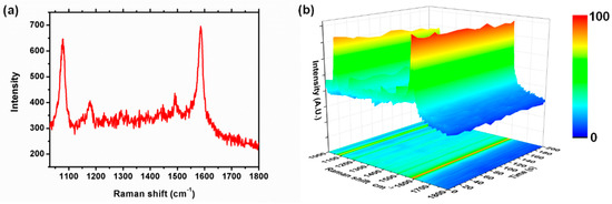 SERS spectra of 4-aminothiophenol (PATP) molecules adsorbed on a SERS substrate surface have been widely investigated. In previous work, bands seen at 1140, 1390, and 1432 cm−1 have been ascribed to the b2 mode, which is selectively enhanced by the chemical enhancement effect [31,32,33]. It has been confirmed that these peaks come from 4,4′-dimercaptoazobenzene (DMAB) molecules due to the dimerisation reaction from PATP to DMAB by surface catalysis, making the observation of SERS spectrum of PATP molecules a challenge [31]. In this work, we attempt to observe the genuine SERS spectrum of PATP with a novel substrate. By one-pot wet chemical method using water solution at room temperature, Pt-based hollow nanostructures were synthesised. Because of the highly damping optical response of the metal, these Pt-based hollow nanostructures exhibited weak dimerising effects with PATP molecules [34]. The genuine SERS spectra of PATP was able to be seen, where the vibrational bands at 1140, 1390 and 1432 cm−1 from DMAB molecules were absent from observation. Furthermore, the SERS spectra remained consistent with the Raman spectra of PATP powder under laser illumination for more than 2000 s, during the experimental measurement process.