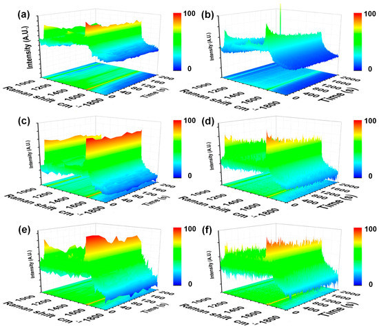 Time-dependent SERS spectra of Pt-based hollow nanostructures on Si, after adsorption of PATP from an ethanol solution, with different laser illumination time. The concentration of PATP in solution and laser irradiation time for collecting Raman spectra from these samples are: (a) 10−5 M, 200 s; (b) 10−5 M, 2000 s; (c) 10−6 M, 200 s; (d) 10−6 M, 2000 s; (e) 10−7 M, 200 s; (f) 10−7 M, 2000 s.