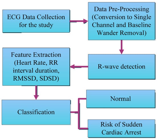 Two databases from the physiological signal online archive Physiobank were utilized in this study: the Sudden Cardiac Death Holter Database (SDDB) and the MIH-BIH Normal Sinus Rhythm Database (NSRDB). The normal patient cohort consisted of 10 records selected from the NSRDB (four males, aged 32 to 45 and six females, aged 35 to 50). The SCA cohort consisted of 10 records selected from the SDDB (five males, aged 34 to 74, four females, aged 62 to 82, and one patient of unknown gender, aged 62). Each ECG dataset consisted of 24-h Holter ECG recordings before and after the SCA event [18]. The full methodology of this study has been outlined in Figure 1 below.