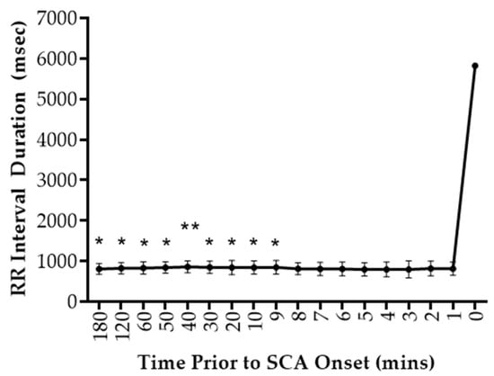 Time series plot of the change in R-R Interval duration prior to the onset of sudden cardiac arrest (n = 10). ECG recordings were taken from patients in the SCA cohort and subjected to processing via MATLAB. The results were recorded as mean R-R interval duration (±standard deviation) denoted by the error bars. Asterisks denote statistical significance by repeated measures ANOVA where * p < 0.05 and ** p < 0.01.