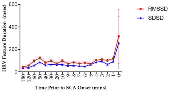 Time series plot of the changes in heart rate variability (HRV): the square root of the mean of differences between all adjacent R-R intervals (RMSSD) and the standard deviation of differences between all adjacent R-R intervals (SDSD) (n = 10). ECG recordings were taken from patients in the SCA cohort and subjected to processing via MATLAB. The results were recorded as mean RMSSD (±standard deviation) and SDSD (±standard deviation) denoted by the error bars.