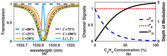 In order to carry out some numerical simulations, let us consider the ro-vibrational line of C2H2 occurring at 1532.8302 nm [24] and use a laser line emission that has a Gaussian profile with 15 pm of full width at half maximum (FWHM) (Figure 2a). Moreover, to perform these simulations, we also considered a gas path length of 5 cm and different C2H2 concentrations within the range from 0 to 100%, at atmospheric concentration. Furthermore, the channels were considered ideal channels without optical losses and therefore . For this case, the overall detector outputs and the depth of modulation are shown in Figure 2b. Here, it can be observed that the signal provided by the measurement detector decreases as the concentration increases, while the depth of modulation increases.