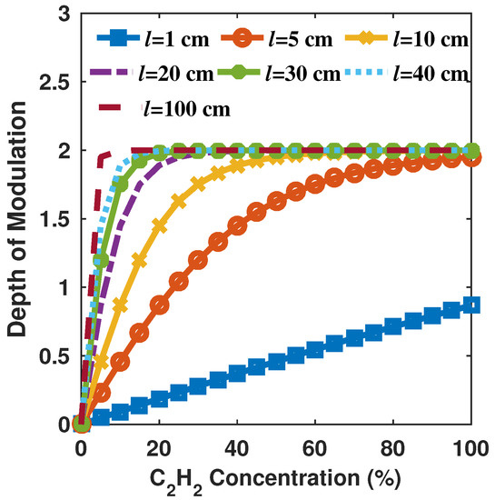 From these simulations it can be appreciated that a path length of 5 cm can be used to implement a sensor capable of detecting relatively high concentrations. However, the proper length can be determined depending on the target concentration range. For instance, in Figure 3, numerical results showing the effect of varying the gas path length are presented. Here, it can be observed that, to measure low concentration levels, it is necessary to select a longer path lengths. This will also increase in a considerable way the sensitivity since the depth modulation rapidly increases with the concentration, for instance, the case when l is in the order of 100 cm. Hence, the length of the cell can be selected depending of the application requirement.