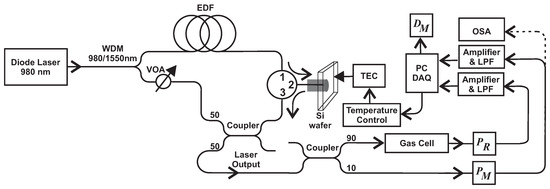 - Gallegos-Arellano, E.; Vargas-Rodriguez, E.; Guzman-Chavez, A.D.; Cano-Contreras, M.; Cruz, J.L.; Raja-Ibrahim, R.K. Finely tunable laser based on a bulk silicon wafer for gas sensing applications. Laser Phys. Lett. 2016, 13, 065102. [Google Scholar] [CrossRef]