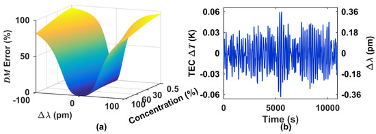 (a) Simulated D error due to wavelength instability and considering different C2H2 concentration; (b) Measured temperature variation of the Si wafer over the time and its induced laser wavelength error.