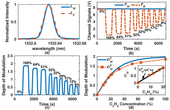 The system signals generated by both detectors, after conditioning, are shown in Figure 6b. It is important to mention that for this case, the experimental k value was calculated as 1.56. In this figure it can be observed that changes in the C2H2 concentration only affects the measurement signal , while the output of the reference channel is always constant. Moreover, when the C2H2 concentration is 0%, the reference and the measurement signals are equal and have maximum value, afterwards, if the concentration increases, the measurement signal level will decrease, which is in agreement with the numerical results (Figure 2b). The calculated depth of modulation as a function of time is shown in Figure 6c. Here it can be appreciated that the depth of modulation increases with concentration and conveniently is 0 when the C2H2 concentration is 0%. For this experiment, we alternated a 0% C2H2 concentration and a given mixture of C2H2/N2. Moreover, in this figure, it can be noted that levels are constant while the mixture of C2H2/N2 remains fixed, which shows the stability of the sensor over the time.