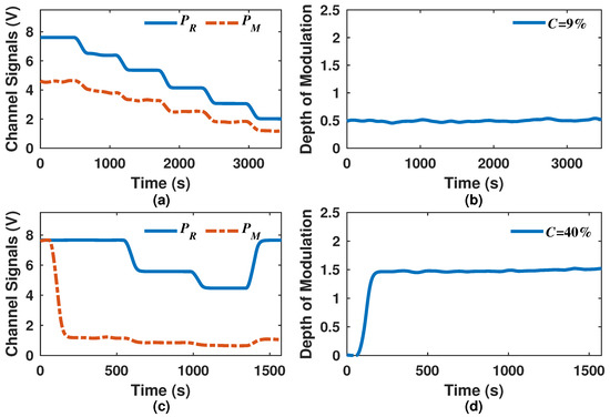 Laser intensity fluctuations can be due to laser power supply fluctuations, drift or aging [2,19]. In the dual path correlation spectroscopy arrangement both detector outputs will change in the same proportion as the laser intensity varies. Therefore, by calculating the depth of modulation, these fluctuations will be canceled. In order to probe this point, in our experiment we intentionally varied the laser line intensity while the gas concentration was left fixed. As an example, the gas cell was filled with a mixture of 9% C2H2 and 91% N2 and after a certain time we reduced the laser intensity five times. This consequently affected the signal levels of both channels (Figure 7a). By using these signals the depth of modulation was calculated and the result is presented in Figure 7b, where it can be appreciated that the depth of modulation is practically unaffected by laser intensity fluctuations. As a further example, we performed an additional measurement, which started with a 0% C2H2 concentration, after we filled the cell with the mixture of 40% C2H2 balanced with N2. At this point the measurement channel signal started to drop (Figure 7c) while the started to increase until it reached its constant state (Figure 7d). Afterwards, we reduced the light intensity in two different times, affecting both channel signals (Figure 7c) while the remained constant (Figure 7d). Finally, the light intensity was increased to its initial value and both channels signals recovered their levels (Figure 7c), while the continued quite stable over the time (Figure 7d). These measurement results are very important since they clearly demonstrate that the dual path correlation spectroscopy is able to minimize large laser intensity fluctuations (Figure 7a,c) by calculating the depth of modulation (Figure 7b,d).