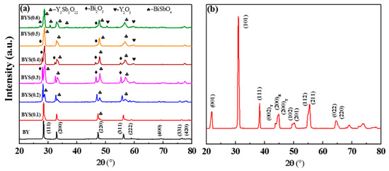 Figure 1a,b shows the X-ray diffraction (XRD) patterns of pre-synthesized Sb2O3-doped Bi[Y(1−x)Sbx]O3 [BYS(x)] (where x = 0.0, 0.1, 0.2, 0.3, 0.4, 0.5 and 0.6) and Pb(Zr0.53Ti0.47)O3 [PZT], respectively. For clarity, only Sb2O3-doped BYS(x) is presented here. The reaction mixture of BYS(x) was characterized by thermogravimetry and differential scanning calorimetry (TG–DSC) to locate the formation temperature. Based on the TG–DSC analysis, undoped BiYO3 (BY) and PZT was calcined at 850 °C, whereas both Sb2O3 and Sb2O5-doped BY was calcined at 800 °C for 2 h. In Figure 1a it can be seen that the major phase formed for the BYS(x) could be related only to the diffraction peak given for BiYO3 (JCPDS No. 271047). However, a tiny peak of Y3Sb5O12 [JCPDS No. 0430160], Bi2O3 [JCPDS No. 0270052], Y2O3 [JCPDS No. 0431036], and BiSbO4 [JCPDS No. 0480469] was observed in the XRD patterns. Moreover, it can be seen that the intensity and the number of second phases increase with increasing Sb2O3 content. Therefore, the XRD studies indicate that the solubility of Sb2O3 in BY is limited to a certain range. According to Shannon’s effective radius [23], Y3+ and Sb3+ with a coordination number of six have radii of 0.90 and 0.76 Å, respectively. The difference in radii between Y3+ and Sb3+ ions is greater than 15%. Therefore, it is not easy for Sb3+ to enter into Y3+, and the solubility of Sb3+ in the system would be limited. On the other hand, the calcined PZT powder was fully stabilized to the perovskite structure (JCPDS No. 01-070-4264) without any second phases.