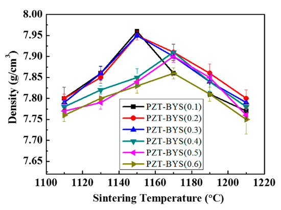 Density of PZT–BYS(x) ceramics sintered in an O2-rich atmosphere at different temperatures.