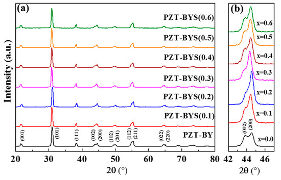 The XRD patterns of PZT–BYS(x) ceramics sintered at their optimum temperatures are shown in Figure 4a. In these patterns, no detectable traces of the pyrochlore or other impurities were observed. Additionally, asymmetry and/or peak splitting in 111 and 200 reflections indicate all of the compositions are exhibiting rhombohedral–tetragonal phase coexistence [14,15,17]. Quantitative analysis of possible change in relative phase fraction as a function of BYS is not within the scope of this work. Nevertheless, the enlarged XRD patterns in Figure 4b indicated that the decrease in 002 reflection with an increasing amount of Sb2O3 is possibly related to the decrease in volume fraction of the long c-axis of the tetragonal unit cell.