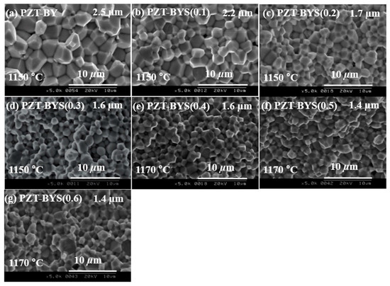 Figure 5 shows the microstructures of the fracture surface containing various amounts of Sb2O3 content sintered at an optimum temperature at which maximum density was obtained. A significant change in grain size was observed with the addition of Sb2O3. The microstructures of the sintered samples are uniform, dense and consistent with the measured density. In the previous work, it was reported that the addition of a small amount of BY abruptly decreases the grain size of PZT due to the pinning effect of the second phase [13]. In the present case, the addition of Sb2O3 doping on PZT–BYS(x) shows a further decrease in grain size. The average grain size of specimens is decreased with the increasing amount of Sb2O3. From Figure 5b, it can be seen that the microstructure of the specimen doped with 0.1 moles of Sb2O3 shows higher uniformity with fine grain size, and an average grain size of 2.2 µm was observed. On further addition of Sb2O3 content, as shown in Figure 5c–g, the average grain size abruptly decreased to approximately ~1.7 µm at x = 0.2–0.3 moles and approximately 1.4 µm for x = 0.4–0.6 moles. This reduction of grain size can be interpreted as a pinning effect of the secondary phases (Y3Sb5O12, Bi2O3, Y2O3, and BiSbO4) as indicated in XRD patterns in Figure 1a.